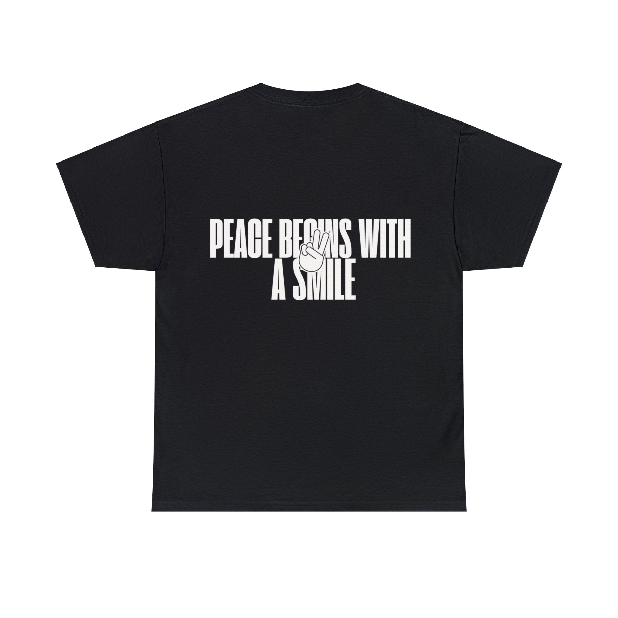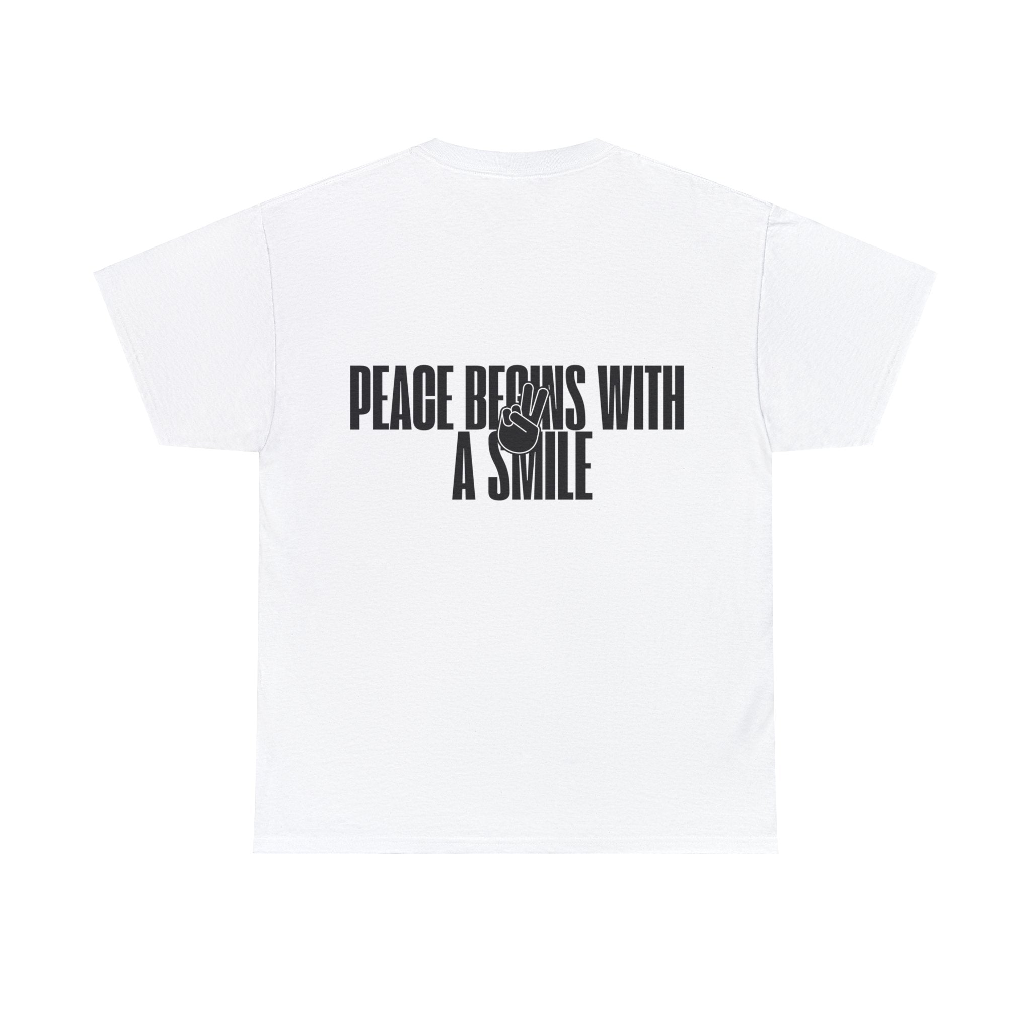Introducing our inspiring "Peace Starts With a Smile" T-Shirt, a garment that embodies the essence of harmony and positivity. This remarkable shirt features the profound message "Peace Starts With a Smile" on the back, serving as a gentle yet powerful reminder of the simplicity and strength found in a smile. It encourages wearers and onlookers alike to consider how small acts of kindness, like a smile, can be the first step towards fostering peace and understanding in our world.